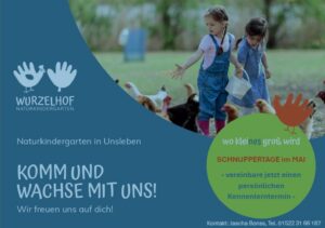 Der Naturkindergarten in Unsleben bietet für alle interessierten Eltern mit Kindern Schnuppertage im Mai an, um den Kindergarten kennenzulernen.